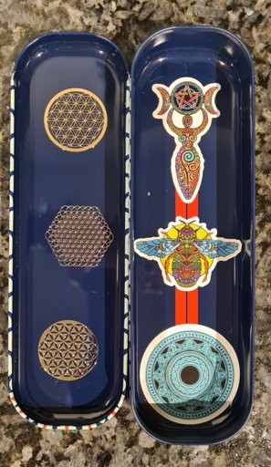 Inside the lid, I have three metal flower of life Metatron’s cube stickers, to represent the journey of energy throughout the universe, and of balance within the universe, to aid with meditation. (I am a bit annoyed I put them on a bit wonky, as they’re so thin, I can’t get them off again without ruining them). The contents of my travel altar are as follows: