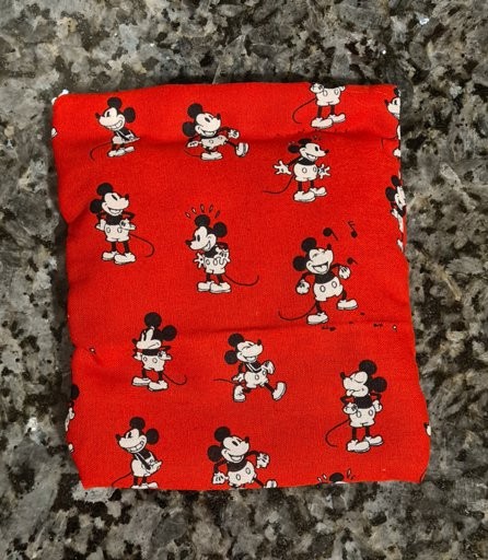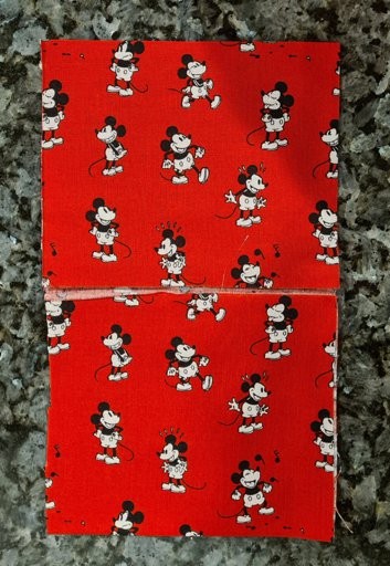 I do a lot of crafts and have drawers full of bits and bobs, including some cute Disney fat quarters (I found these in Aldi a few years ago). I chose a nice pattern and cut it to the size I needed and hand sewed it, inside out, along two sides, with one side left open and a flap to tuck in. Once sewn, I then turned it inside out again, so that it was the right way round and the two sewn sides were now on the inside.