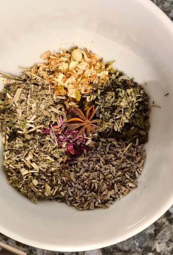 • 2 chamomile teabags (opened and emptied, but you could use loose, dried chamomile flowers) – for it’s mild tranquillising effect and sleep inducing properties; • 1 piece of star anise – to repel nightmares (use sparingly); • 2 teaspoons of catnip – for increasing restful sleep; • 2 teaspoons of lemon balm – for it’s ability to reduce anxiety and insomnia, in addition to relieving stress; • 2 teaspoons of jasmine flowers – to reduce stress and anxiety, help with symptoms of depression and to help get a good night’s sleep; • 2 teaspoons of mugwort – for pleasant dreams and to help fall back to sleep if awoken (I do this a lot, so need something to help me fall back to sleep again); • 2 teaspoons of rose petals (mine were pinky red, but you could use any colour) – for loving and peaceful thoughts and dreams; and • 2 teaspoons of Lavender – for it’s anxiolytic (anxiety relieving) properties and as a sedative, to increase relaxation and calm, and help for bringing about sleep.