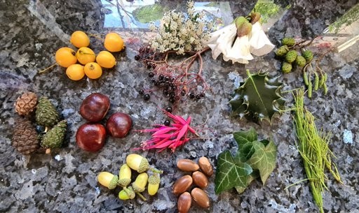 I foraged some branches of hawthorn, apple, hazel, pine and whatever else I could find in my local environment (all thoughtfully and thankfully taken, with offerings of nuts left, to give thanks).