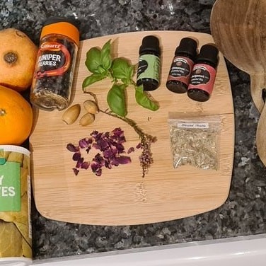 It is a collection of specific items (plants, herbs, flowers, nuts, oils, crystals, spices etc), in addition to a bespoke spell I have created, to provide protection, prosperity, health and happiness for my family and I.