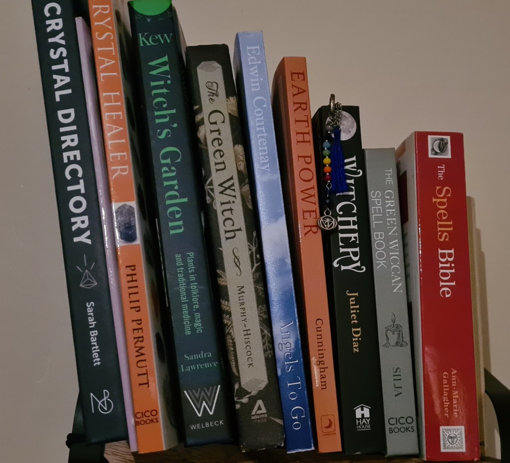 I also have some little shelves on the wall above it, where I store more of my crystals, drawer of supplies and some of my many Witchcraft books.