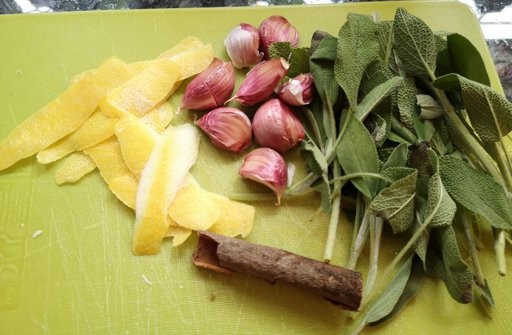 Then add the cinnamon stick and garlic to the pot and allow them to sizzle in the oil for a minute or two. Return the chicken to the pot, along with the milk and sage leaves. Use a vegetable peeler, or sharp knife (please be careful!) to cut wide strips of skin off both lemons and add them to the pot as well.