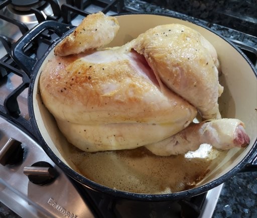 Then place a hob/oven proof pot (I used a deep, cast iron, casserole dish, with double handles), that can fit the chicken snugly within it, over a medium-high heat on the hob/stove. Add to this pot the butter and olive oil. When the butter has melted and is starting to foam, add the chicken to the pot and fry it, turning every few minutes, until it has browned all over. I made sure to turn the chicken deosil (clockwise), to promote my positive intentions.