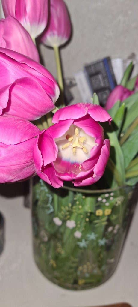 I went to the supermarket this evening to pick up a few bits and bobs and they had these beautiful tulips on sale for 10p! I thought I could give them a good home and they can be used for my Ostara Altar display too.